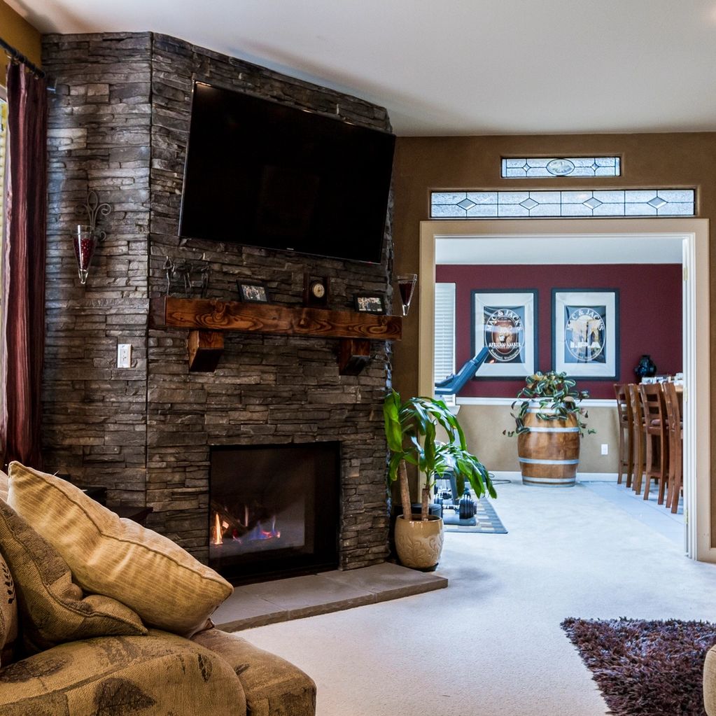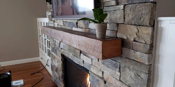 A natural gas fireplace, stone facade, and a heavy timber custom mantle