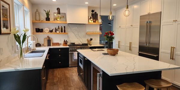 This is the photo of the finished kitchen. Client decided that she wanted floating heavy wooden shelves instead of wall cabinets and darker base cabinets.