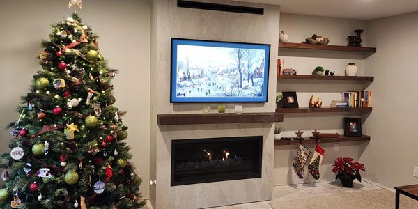 This is the photo of the finished project, fireplace and floating shelves. The tiles are large profile 24x36 with a marble look and no grout.