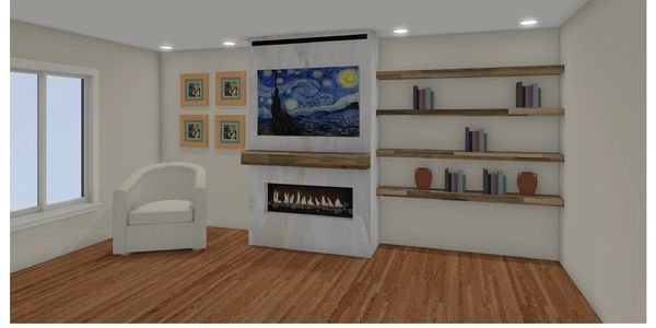 This is the 3d image created for the client in the design process, for a new fireplce with tile surround, and floating wooden shelves.